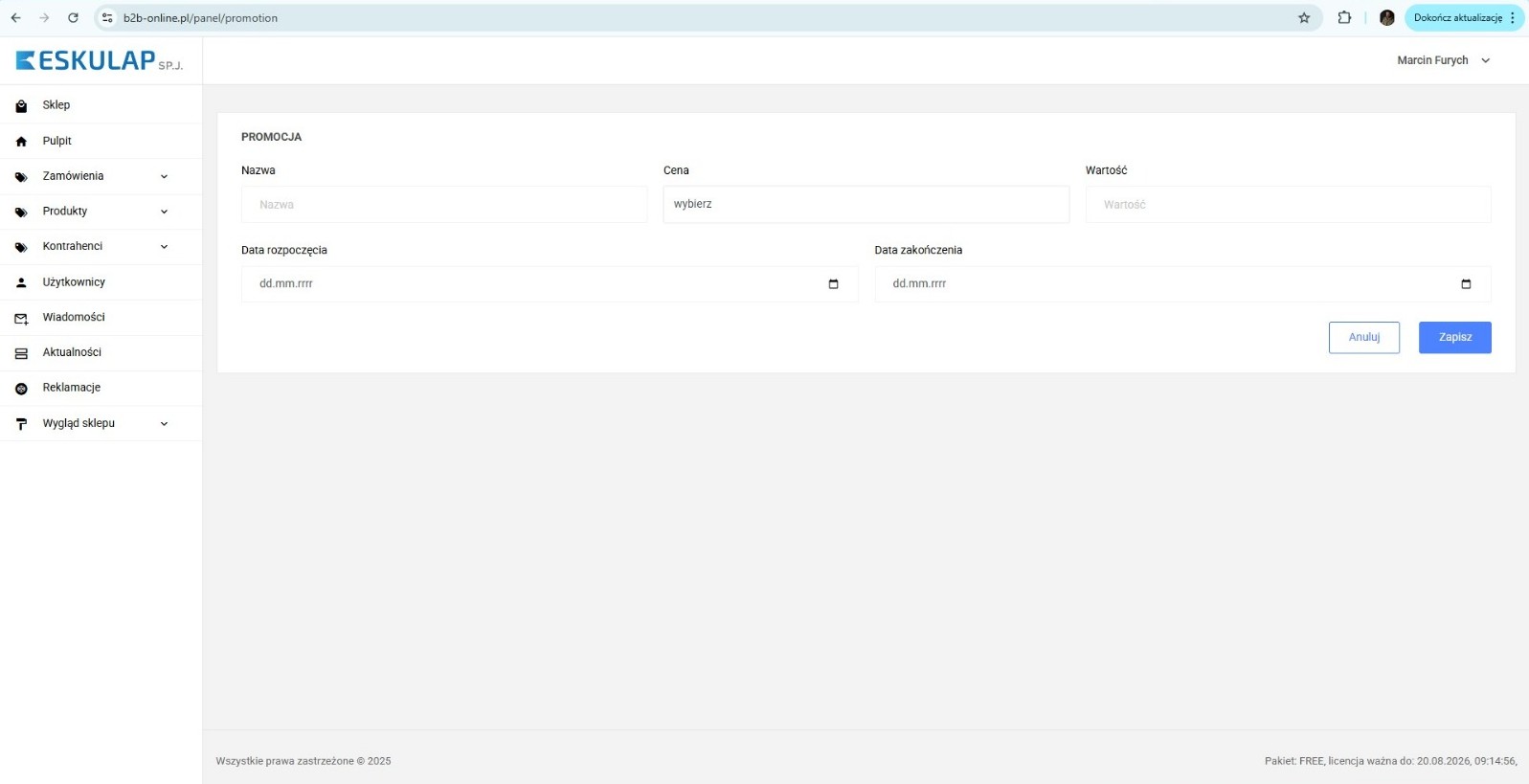 - W „Promocjach” wybieramy przycisk „Dodaj promocję” i uzupełniamy wszystkie pola (nazwę, jakiej ceny ma dotyczyć promocja czy klienta czy hurtowej czy tej i tej, jaki procent upustu ma być w tej promocji, od kiedy do kiedy ma obowiązywać) robimy zapisz