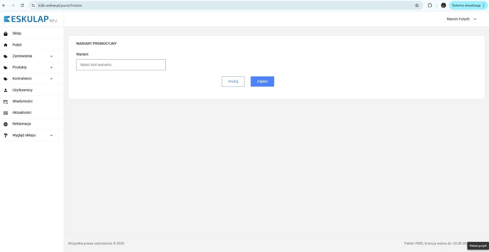 - Wariant – wybieramy wariant produktu, którego ma dotyczyć promocja, wpisując kod z ERP. Pole podpowiada warianty po wpisaniu 3 znaków.