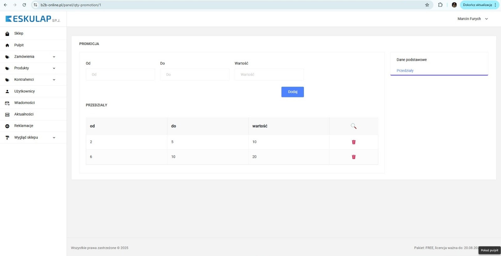 Po zapisaniu promocja pojawi się w tabeli. Należy następnie wejść w edycję promocji i określić przedziały – po zakupie jakiej ilości produktu będzie naliczany procent upustu: